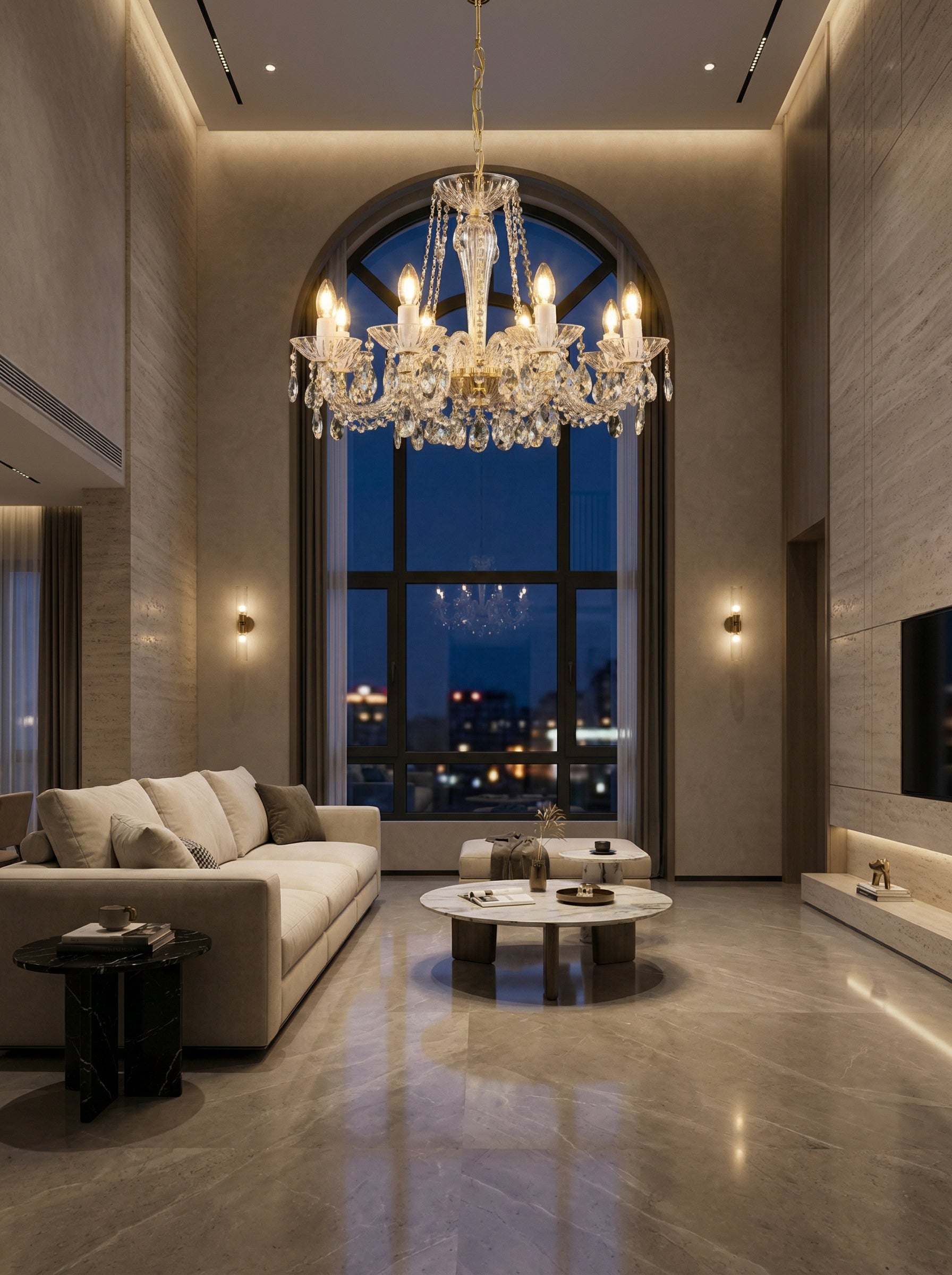 La déclinaison la plus majestueuse de la collection. Le Queen Marie – Octave présente 8 bras en col-de-cygne torsadés en cristal bohème, une colonne balustre cannelée et une couronne supérieure finement taillée. Les bobeches facettées réfléchissent la lumière, tandis qu’une double nappe de guirlandes d’octogones et des pendeloques “poire” grand module créent une pluie d’éclats prismatiques. La monture en laiton doré réchauffe la scène sans altérer la pureté du cristal. Idéal pour salon principal ou salle à manger, il délivre une présence royale et un éclairage régulier, net et scintillant — fidèle à l’esprit Queen Marie, en série limitée avec certificat.