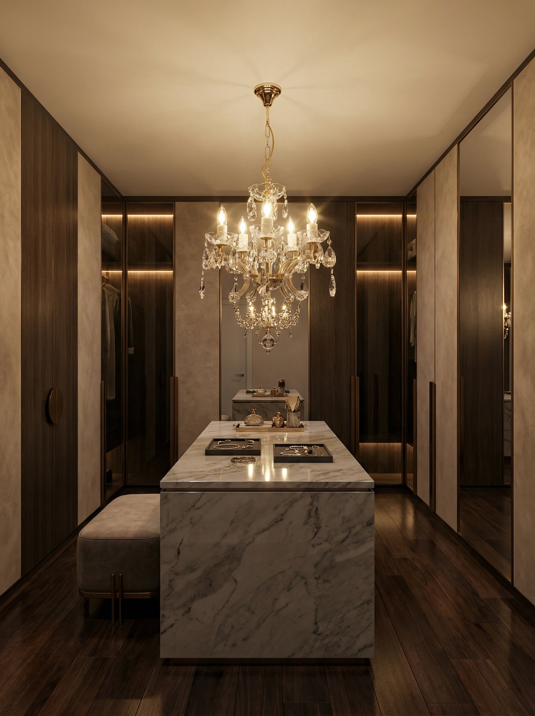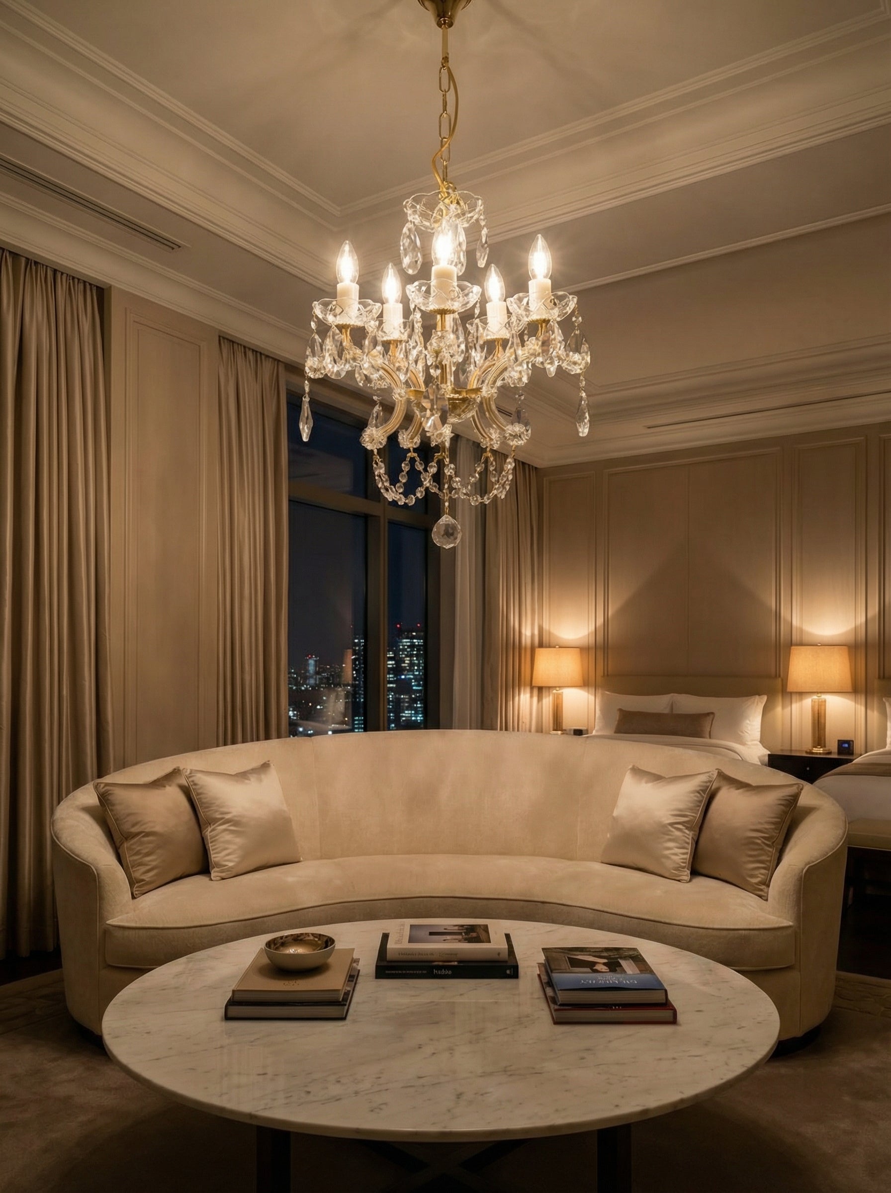 Une interprétation plus aérienne et “bijou” du grand classique Marie-Thérèse d’Autriche. Ses bras finement galbés sont habillés de cristaux taille poire et de guirlandes de perles qui dessinent un drapé lumineux, terminé par une superbe pampille centrale qui signe la pièce. Les coupelles en cristal diffusent une lumière douce et flatteuse, tandis que les pendeloques créent des éclats nets et sophistiqués.